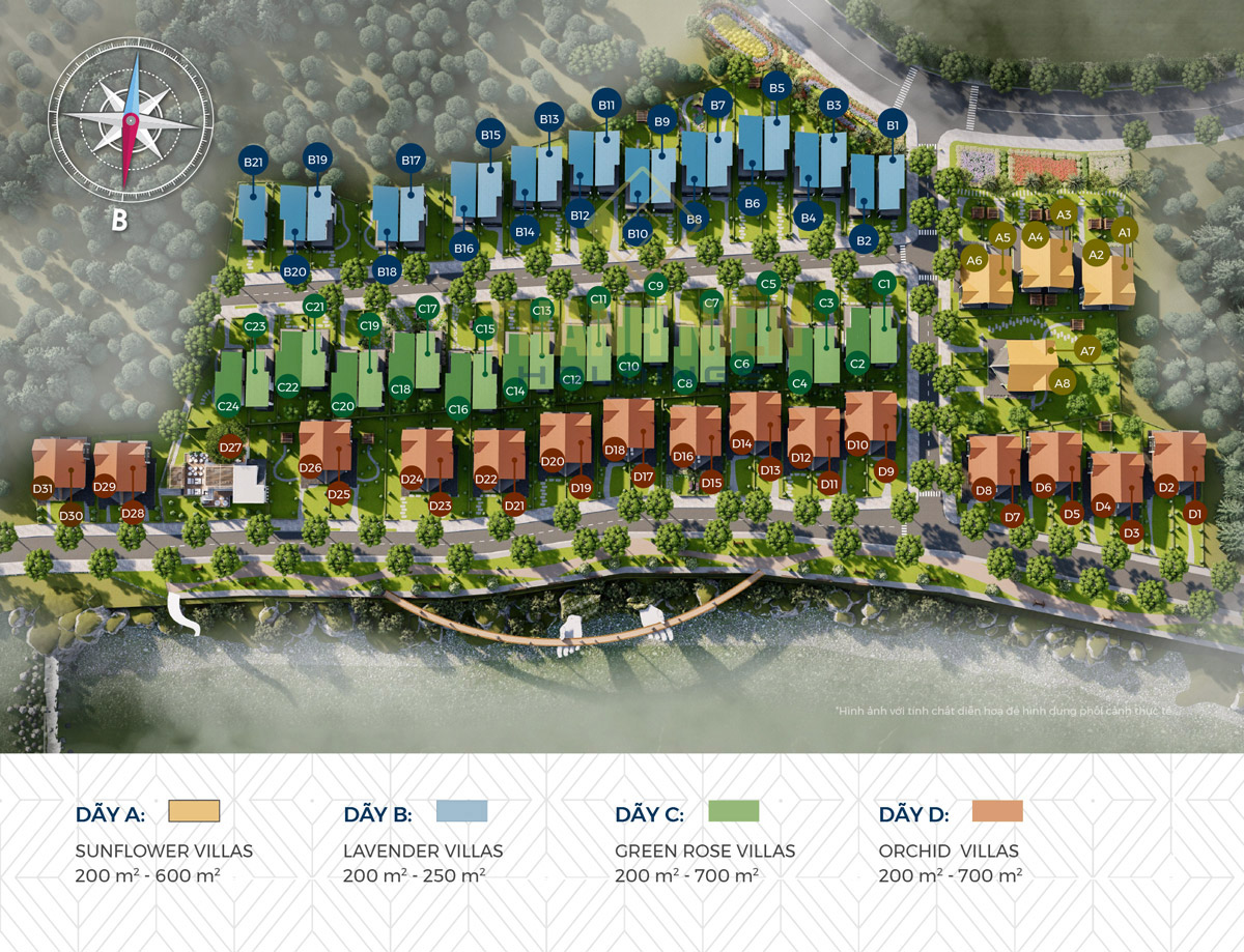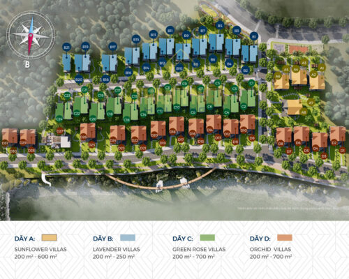 Mặt bằng dự án Dalat Pearl với quy mô lên đến 5 Ha, mật độ xây dựng 37,88% và được phân chia quản lý thành 4 phân khu lấy tên theo các loài hoa gồm: Sunflower Villas, Lavender Villas, Green Rose Villas và Orchild Villas.