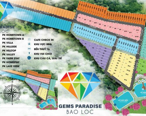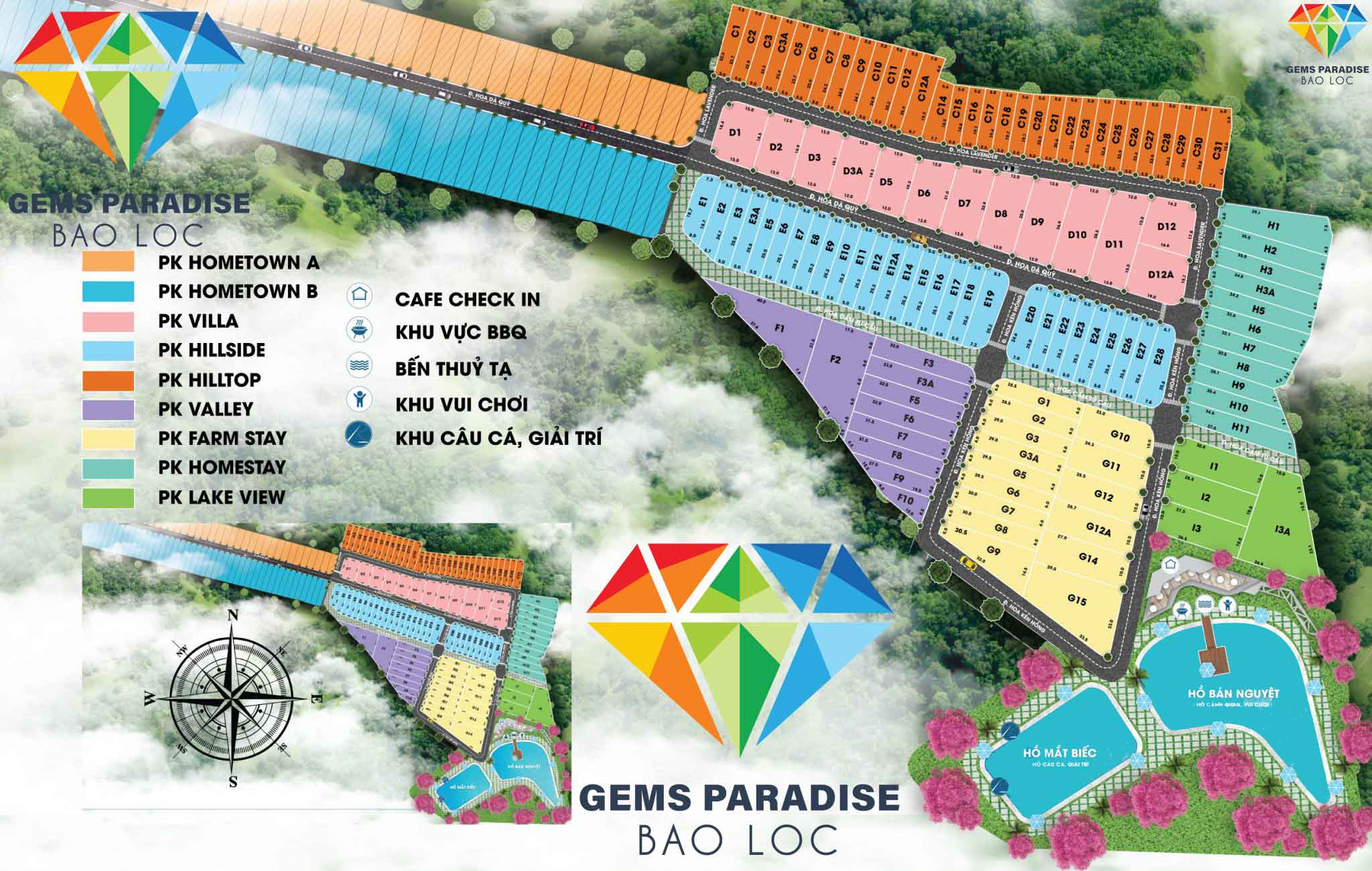 Mặt bằng dự án Bảo Lộc Gems Paradise được quy hoạch với tổng diện tích 4 ha, chia thành các khu vực như khu Hometown, khu Hillside, khu Farmstay, khu Villa, khu Homestay và Thúy Tạ. Trong đó: